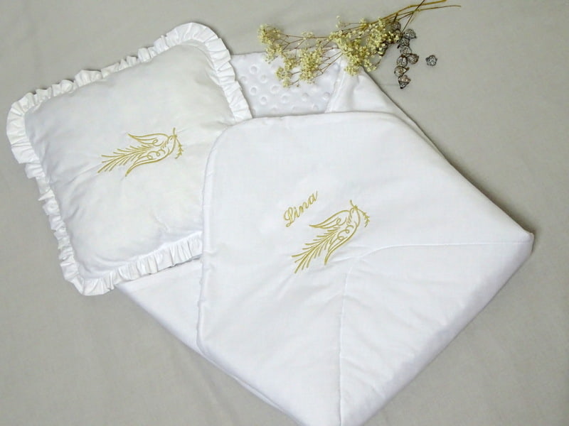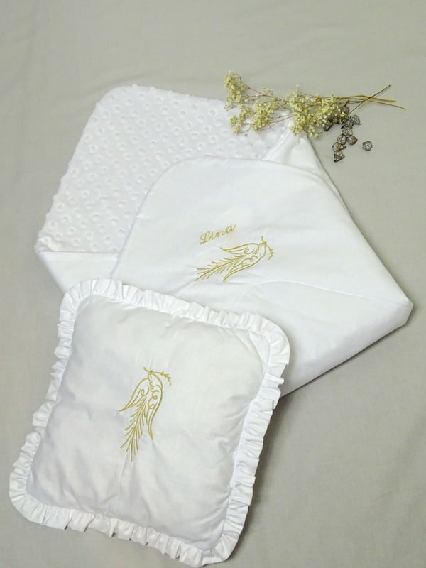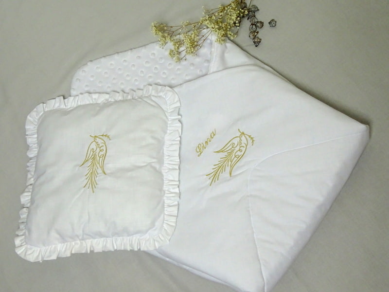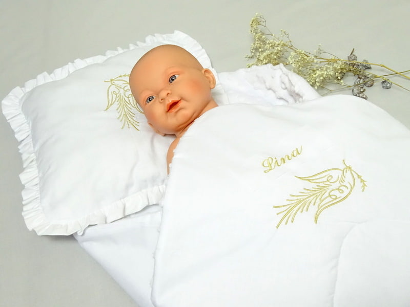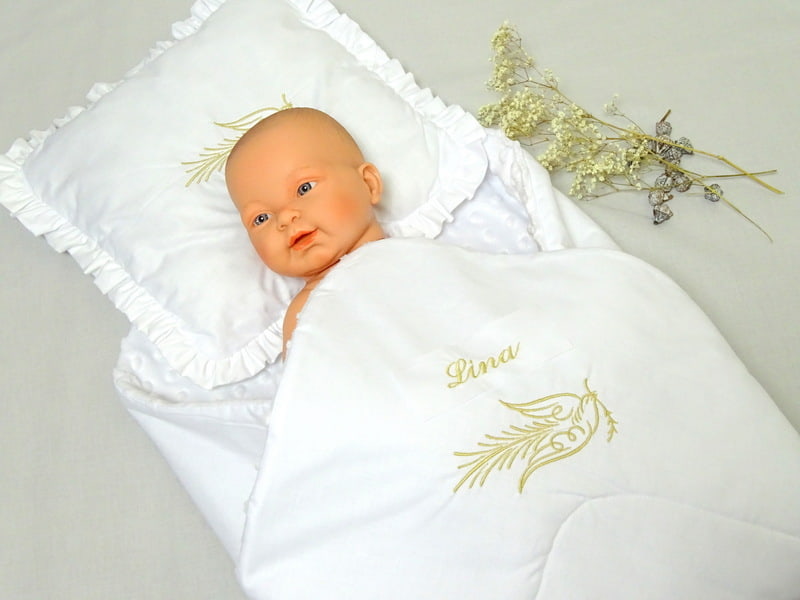 Das Babyhörnchen Taufe wird aus 100% Baumwolle und Unterstoff Minkystoff 100% Polyester gefertigt. Der Stoff fühlt sich angenehm weich an und ist für empfindliche Babyhaut geeignet.