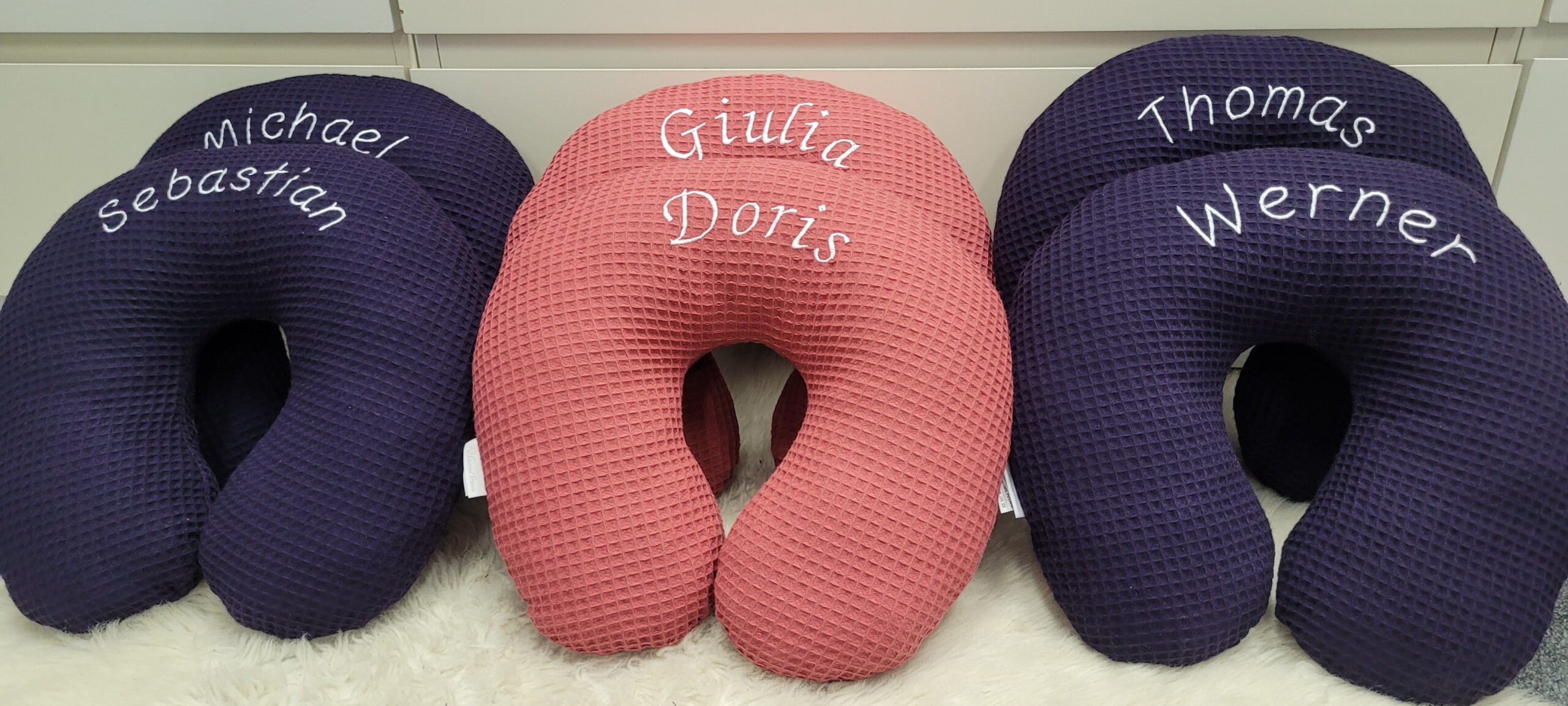 Auf Wunsch kann dein Nackenhörnchen mit einem Namen personalisiert werden. Dadurch wird das Kissen zu einem persönlichen Begleiter.