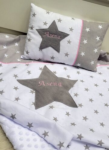 Ein Highlight in jedem Babydecke und Kissen Set ist die aufgenähte Applikation. In diesem Design ist es ein Stern, der sowohl auf der Babydecke als auch auf dem Kissen wiederzufinden ist. Dadurch entsteht ein einheitliches Gesamtbild.